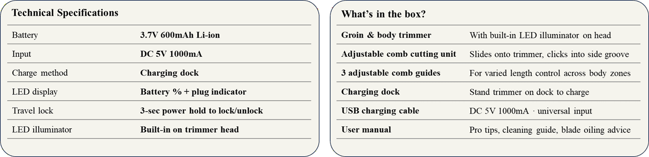 Built-in LED light on the trimmer head provides clear visibility in hard-to-see areas - a standout feature for confident, precise grooming.